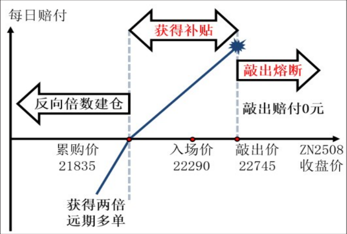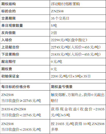 交易入场:2025年5月29日,企业正式启动首笔交易。标的合约为ZN2508,入场价格为22290元/吨,价格上限为22745元/吨,价格下限为21835元/吨。价格区间内,每日观察数量为5吨,反向倍数为2倍,敲出赔付为0元,开仓保证金为2200元/吨,交易期限为35个交易日。